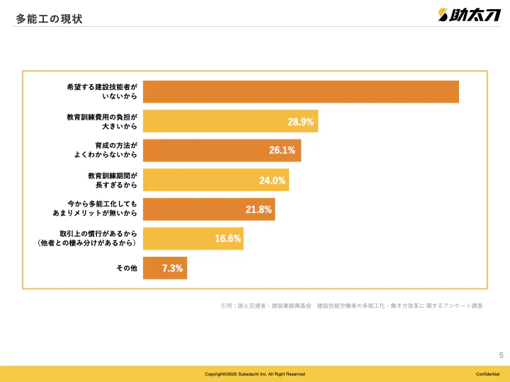 当社は、建設現場で働くすべての人を支えるアプリ「助太刀」を運営しております。登録事業者数は16万を超え、建設業界におけるマッチング領域では圧倒的なシェアを誇ります。「助太刀」では建設業界のあらゆる課題を解決するべくマッチングサービスをはじめ、求人、ファクタリング、EC など様々なサービスを展開しております。「助太刀」は国土交通省の「令和2年度i-Construction大賞」において国土交通大臣賞をしており建設業のDX を推進する優れた取り組みとして評価いただいております。
