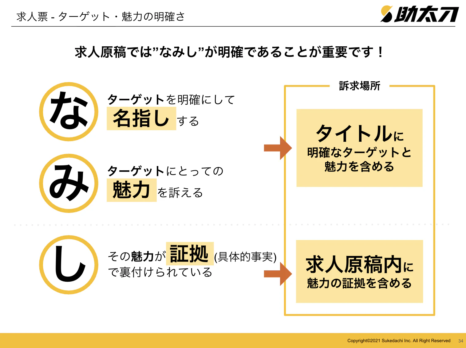 2.求人票は「な・み・し」:ターゲットを名指しし、魅力を伝え、その証拠を示す。この3原則で求人票を見直しましょう。