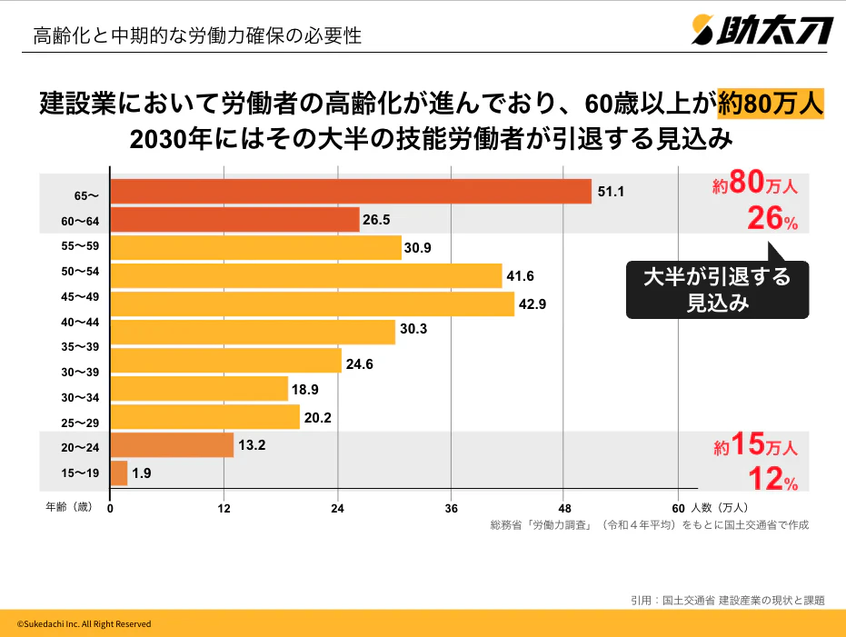 建設業の技能労働者は高齢化が急速に進んでおり、現在60歳以上が約80万人いるとされています。2030年には、その大半が引退する見込みです。