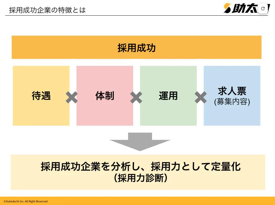 助太刀では、無料で採用力診断を行っています。まずは自社の「採用力」が市場の中でどのレベルにあるのか、どこに課題があり、どこが強みなのかを客観的に把握することからはじめてみてはいかがでしょうか。