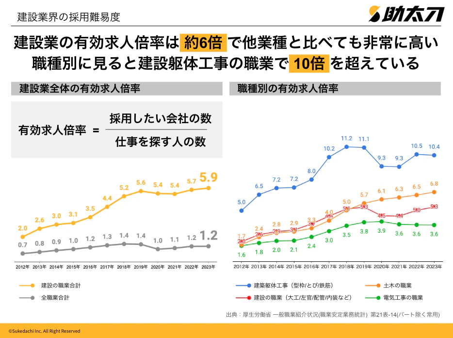 建設業の有効求人倍率は、全産業の平均を大きく上回り、約6倍に達しています。これは、1人の求職者を6社で取り合っている状況を意味します。