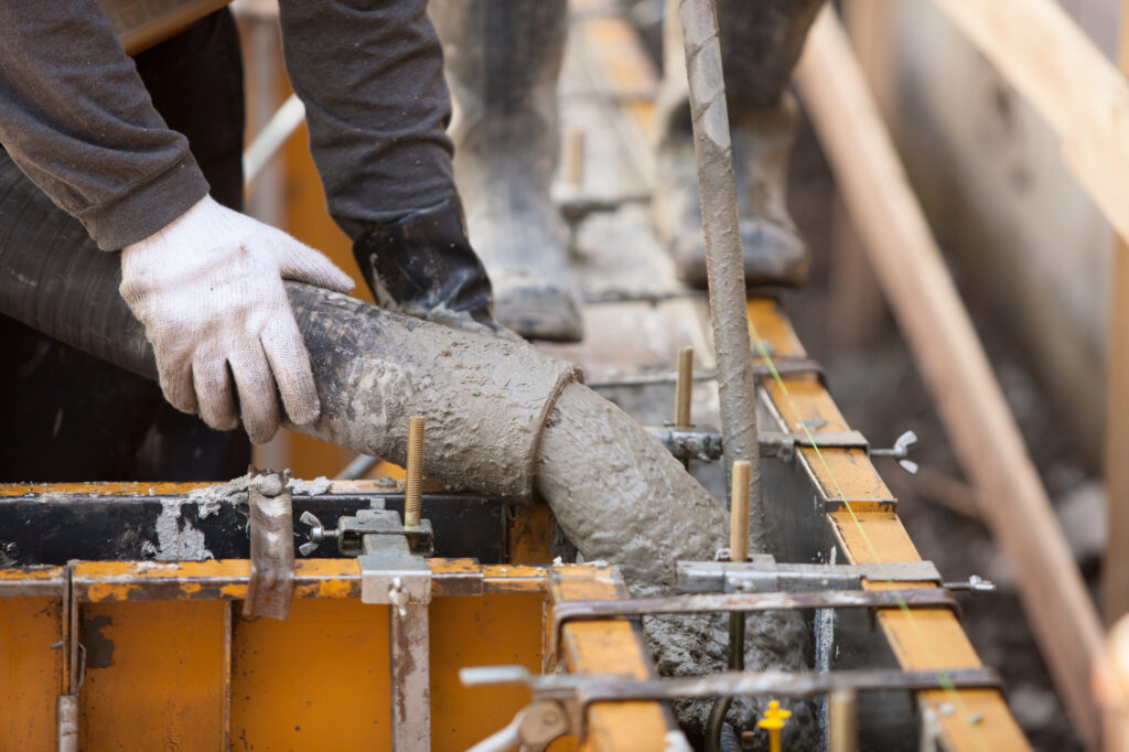 型枠の取り付けが終わったら、生コンクリートを流し込んでいきます。生コンクリートの粘度は季節によって調整が必要なため、熟練の経験を必要とする作業です。