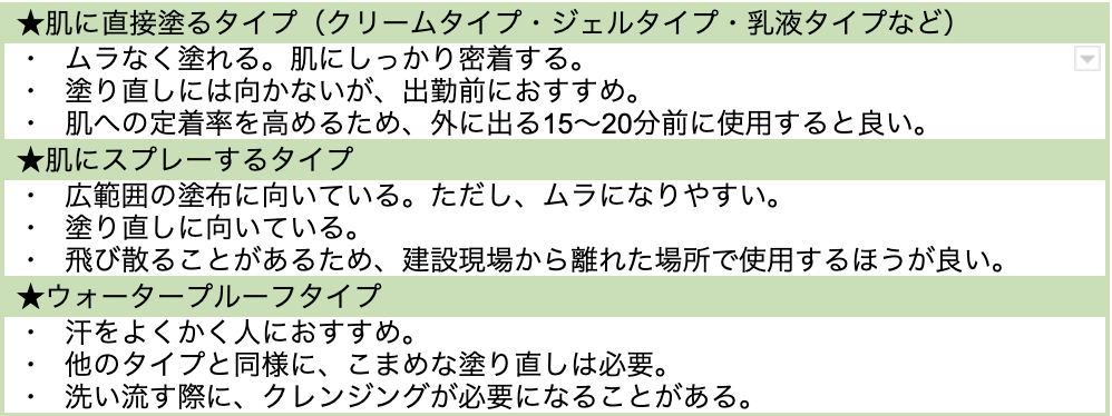表:タイプ別にみた日焼け止めの特徴
