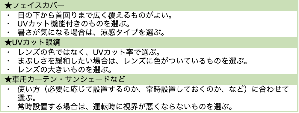 表:日焼け対策グッズ(日焼け止め以外)を選ぶ際のポイント