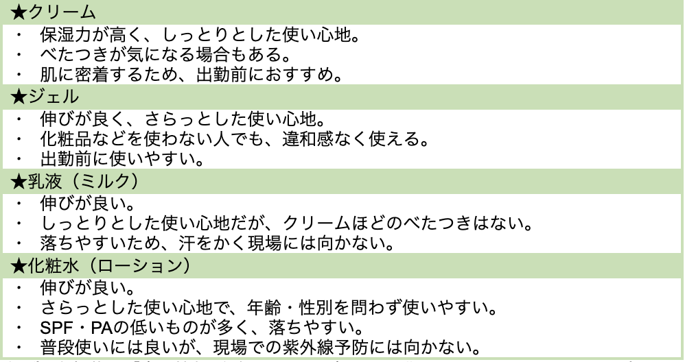 表:日焼け止めの剤型別の特徴