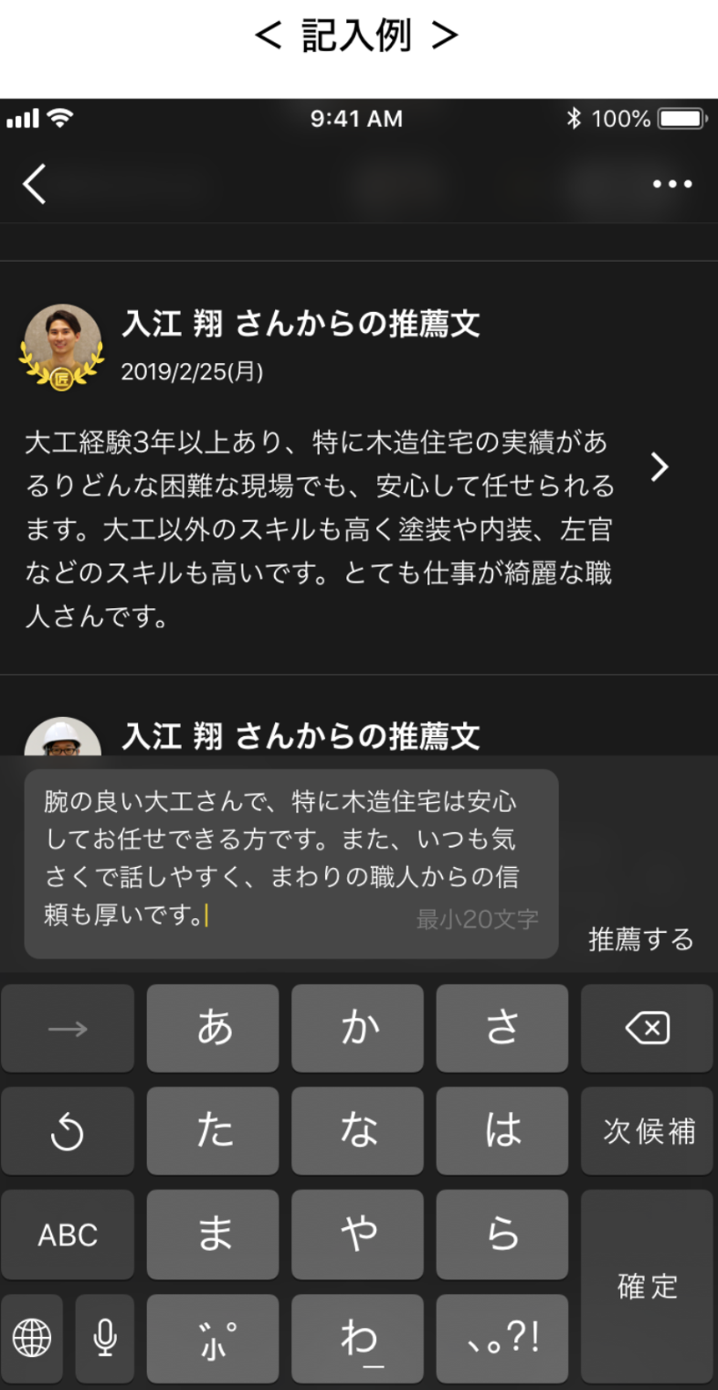 推薦文は、知り合いからの客観的な印象なので、初めて見た人がその人を判断する、大事な情報になります。推薦文が書かれていることで発注者も安心して連絡を送る事ができるようになります。推薦文を書いてもらう為には、まずご自身が相手の推薦文を書く事が近道です。