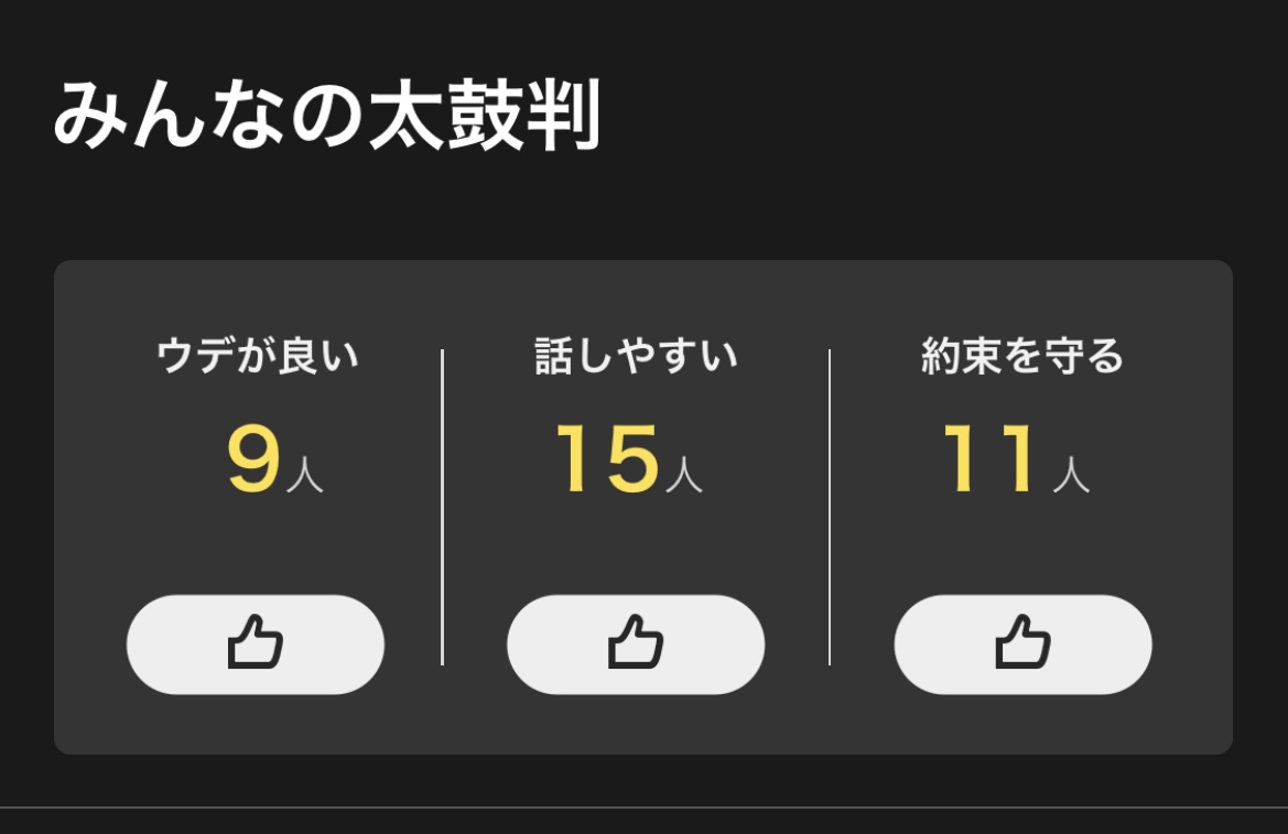 太鼓判を押すタイミングは、メッセージをした後、実際に会ってみた後、仕事をした後、などその人のことを良いなと思った時に、気軽に押すことができます。太鼓判も推薦文も何度でも変更することが可能です。