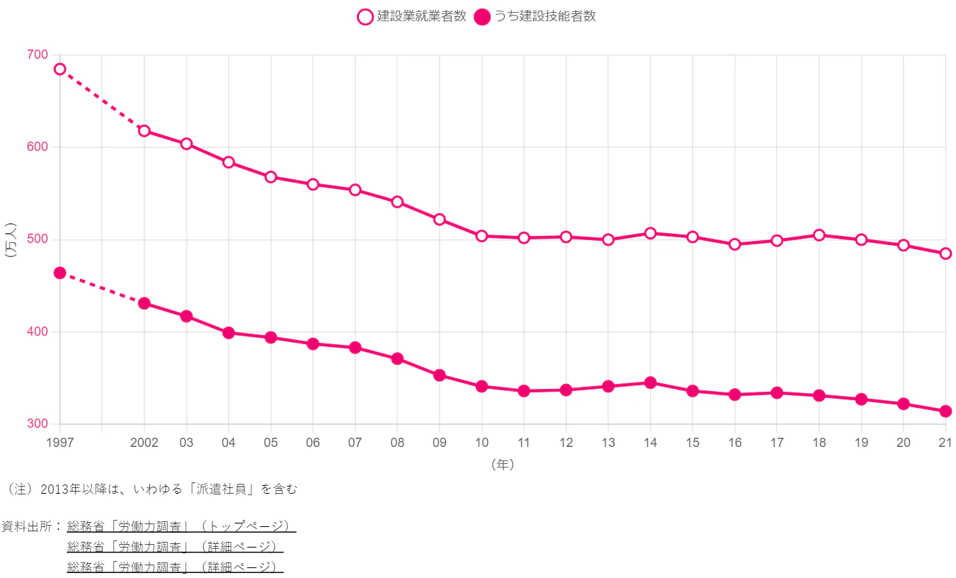 一方で、建設業の就業者数は年々減っており、1997年の685万人と比較し、2021年には485万人まで減少しています。