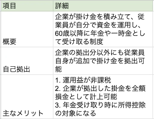 確定拠出年金制度は、企業が掛け金を積み立て、従業員が自分で資金を運用して受け取る年金制度です。概要は以下です。