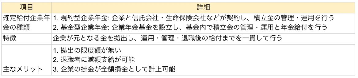 確定給付企業年金は規約型と基金型に大別されます。規約型は、経営者と従業員が合意した年金規約に基づいて企業と信託会社や生命保険会社などが契約し、積立金の管理・運用を行います。その他、概要は以下です。