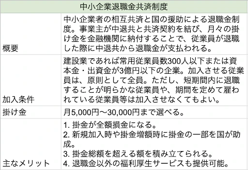 この記事では、建設業退職金共済制度の概要や条件、その他の制度について説明します。