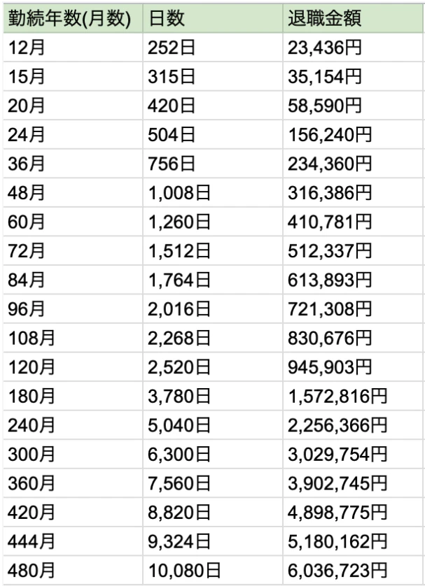 退職時には、運営団体が従業員に対して退職金を支払います。退職金は、従業員が24ヶ月以上勤務した場合に支払われます(死亡した場合は12ヶ月以上)。また、働いた期間が長くなるほど、受け取る退職金の額が増えます。