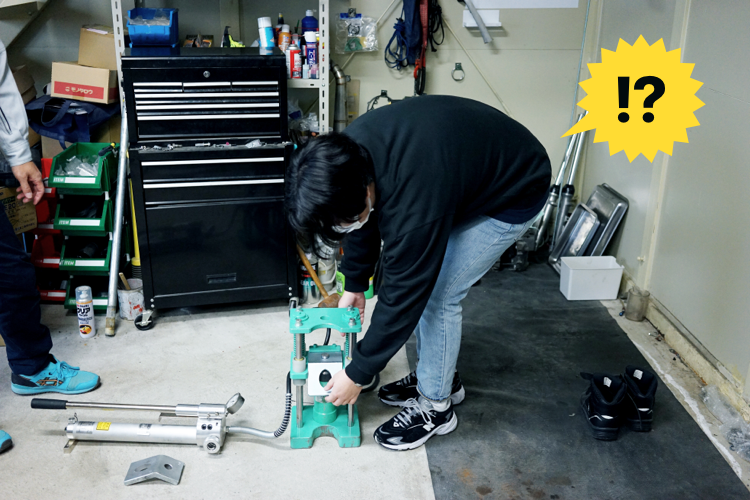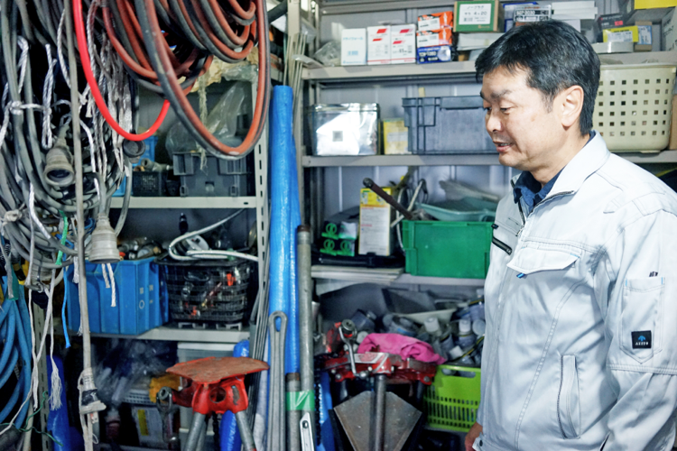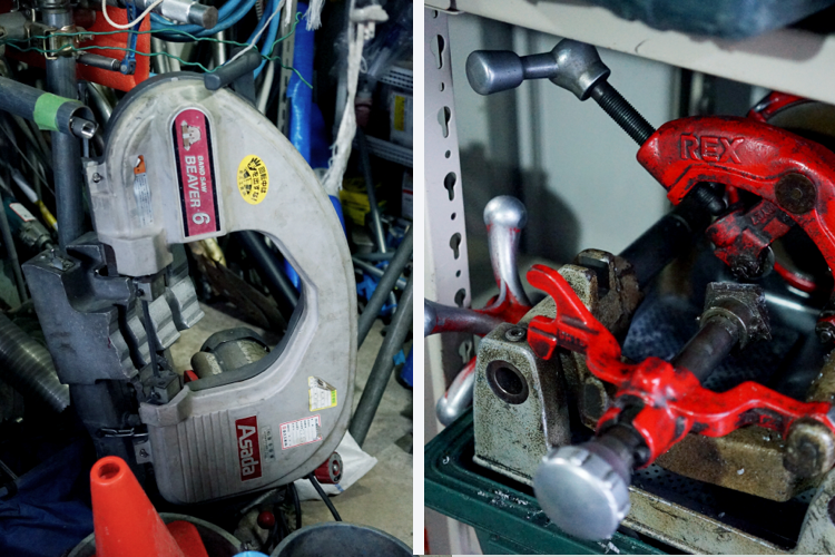 ズラリと並ぶ道具の数々、巨大パイプレンチを運ぶ内藤さん