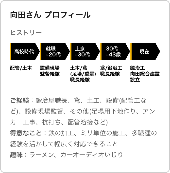 メインは鍛冶屋になりますね。20年以上建設業界に従事していまして、他にも土工・鳶・設備・オペレーターなんかをやってきました。作業で分けると鍛冶屋、土木(穴掘りなど)、配管工、建築土木(コンクリ打設)、足場鳶、重量鳶などもやってます。