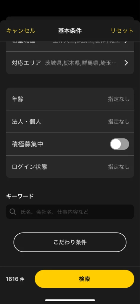 希望条件を指定して元請けさんや職人さんを検索し、「この人とつながりたい」と思った相手にメッセージを送る事ができます。