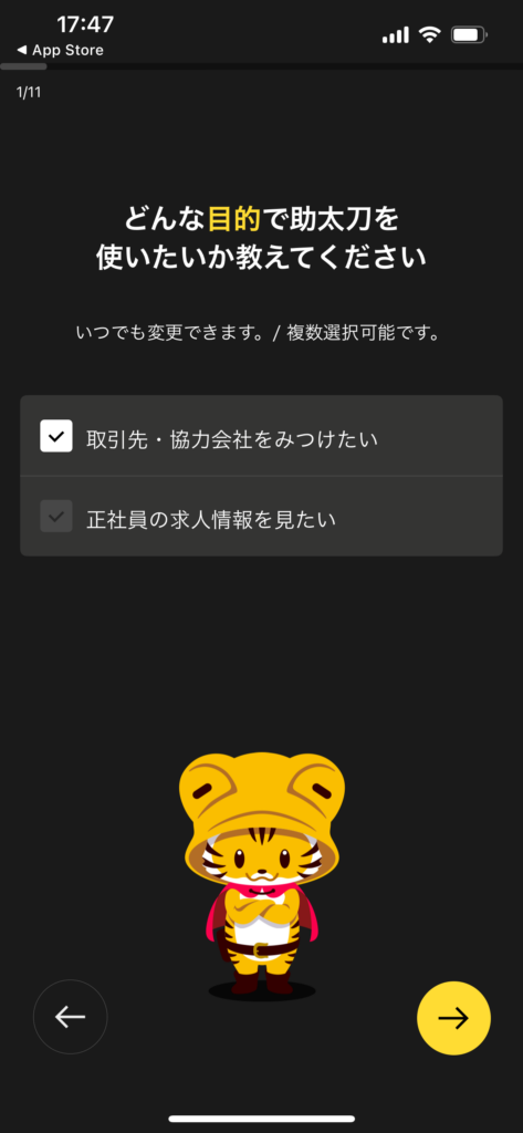 助太刀くんの案内に沿って、助太刀の利用目的やお仕事の経験など、必要項目を入力すれば完了です!