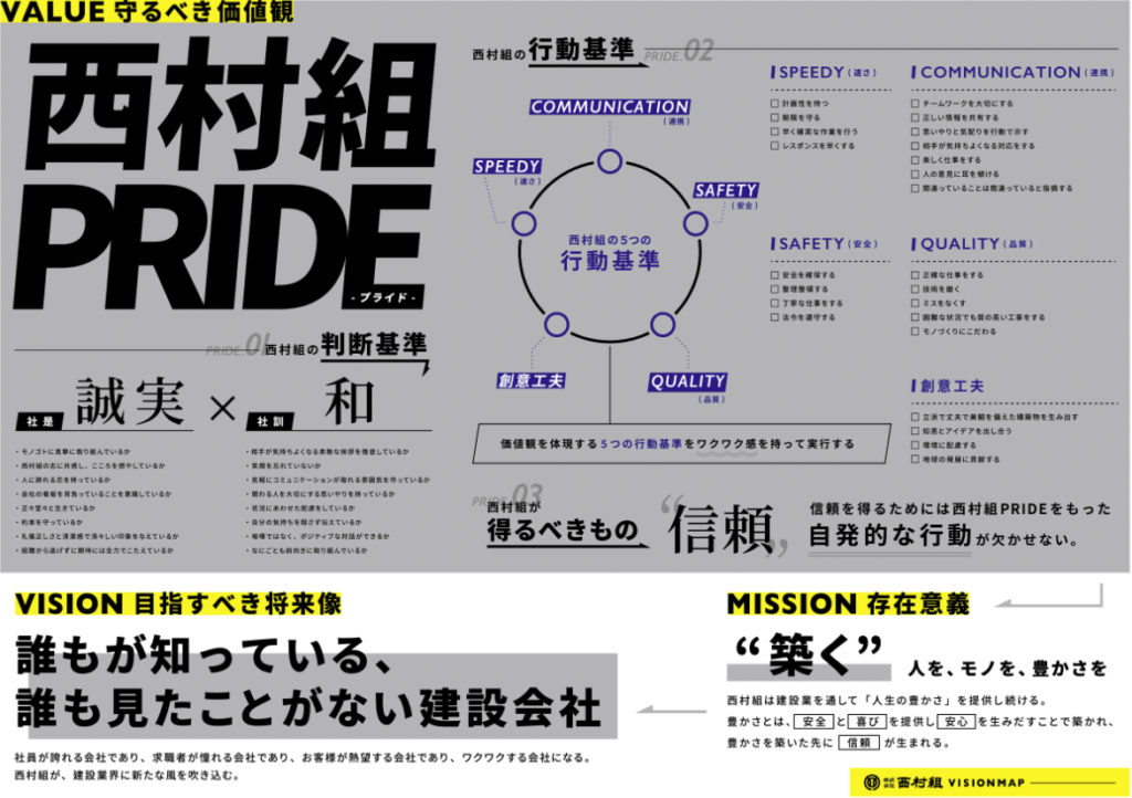 西村組のビジョンマップ。目指すべき未来の姿をそれぞれ『VALUE』『MISSION』『VISION』として言語化