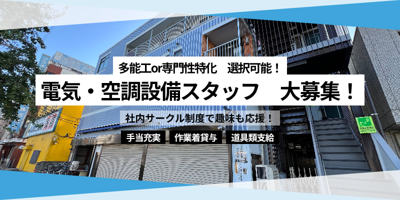 設備/雑工、強電、弱電、太陽光、空調(配管)、空調(冷媒)、衛生(配管工)、衛生(水道)、施工管理(電気)、施工管理(管工事)